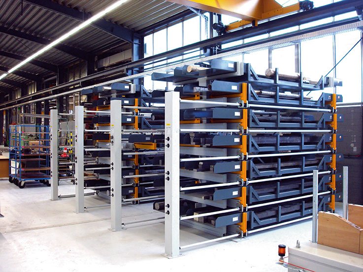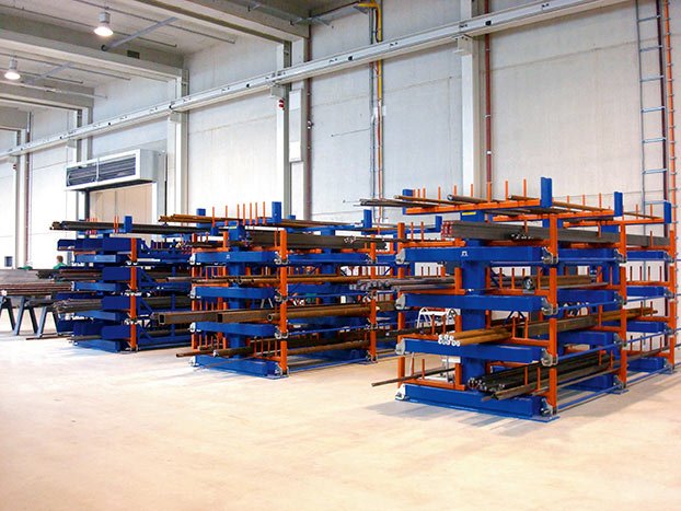 金屬管材存放貨架的伸縮移動式結構,特別為行車存放貨物而設計研發的,行車存放長貨物 管材 棒料 軸 桿 型材 鋼材等可以節省叉車及巷道還有轉彎時占用的空間,6米、12米的貨物要預留好幾米的空間但使用行車存放只要預留懸臂伸出的空間就可以了 如何能夠將凌亂的倉庫整理的更加整潔,存儲更便捷呢